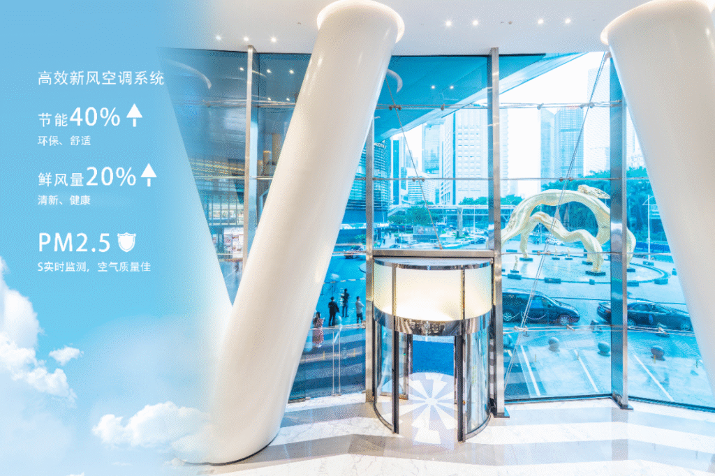 健康数据引领:健康数据监测为写字楼的健康建筑管理提供了科学依据。通过智慧楼宇系统,即时监测空间的健康指标,为城市健康管理提供数据支撑。例如,通过三重净化技术(新风预过滤+MERV13静电除尘+HEPA深度净化)、光催化分解VOCs及智能风量调节系统,实现室內PM2.5浓度≤5μg/m³、CO₂含量<800ppm,远超国际健康空气标准;通过对甲醛、TVOC、臭氧等12项空气指标即时监测,动态优化新风能耗;同时,依托BIM空间建模与BA系统智能联动,精准控制区域送风效率,空气污染物综合去除率超99%,为租户打造「会呼吸的绿色空间」,重新定义智能建筑的生态未来。