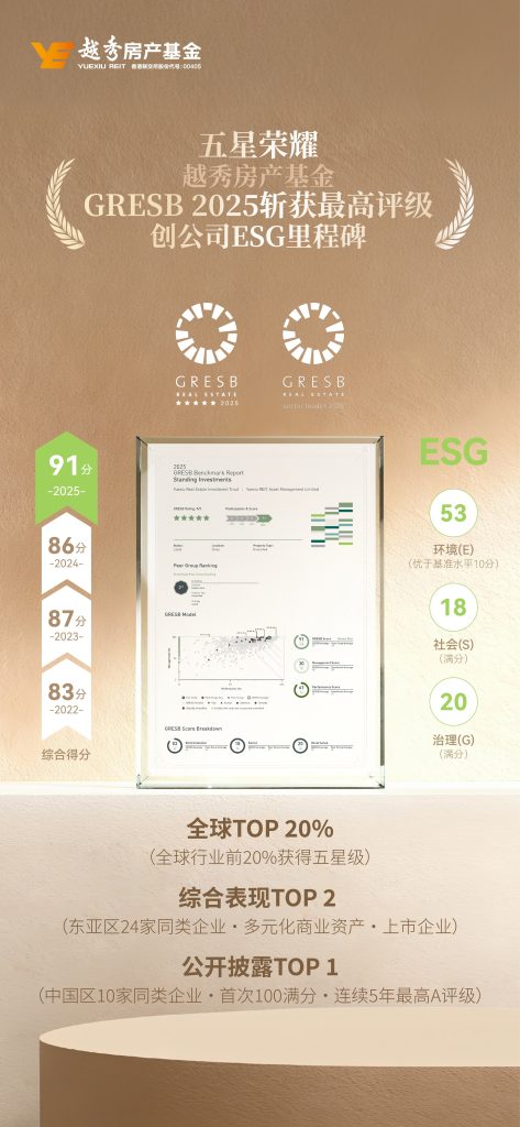 In the 2025 GRESB assessment, Yuexiu REIT achieved full marks in both the Social (S) and Governance (G) dimensions, while the Environmental (E) dimension scored 10 points above the peer group average, driving its overall score to rise from 86 to 91out of 100, ranking second among the group of listed companies investing in diversified properties in Eastern Asia. In sub-categories, Yuexiu REIT received full scores in leadership, policies, reporting, risk management, risk assessment, targets, tenants and community, data monitoring and review.