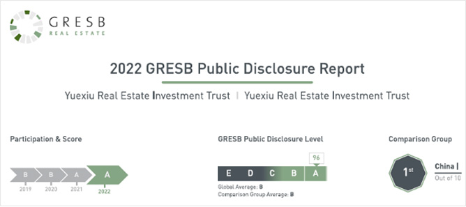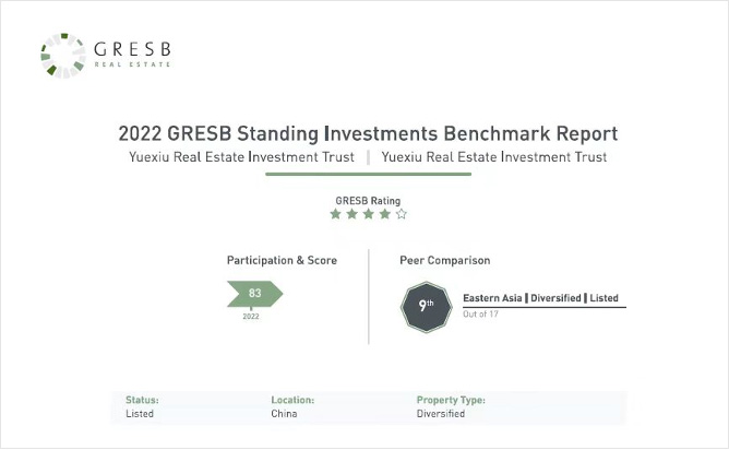 In October 2022, the Global Real Estate Sustainability Benchmark ("GRESB") announced the results of its 2022 rating, in which Yuexiu REIT (00405.HK) was upgraded to a Green Four-Star rating for its outstanding overall performance in this year's GRESB assessment. Yuexiu REIT also received an "A" rating for public disclosure (the highest level under this disclosure standard) for the second consecutive year, gaining high recognition from international benchmarks for its ESG performance!