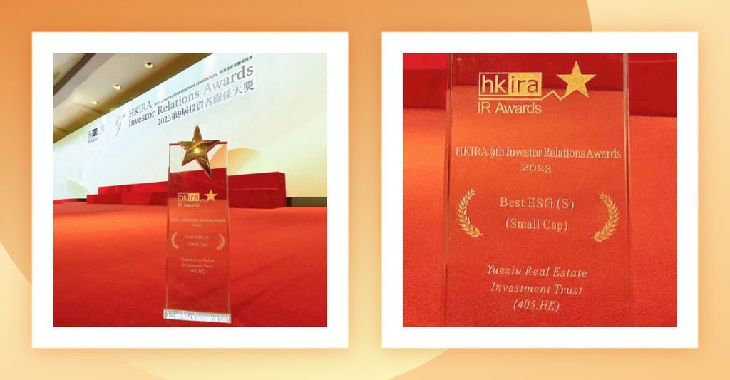 On 28 June 2023, Yuexiu REIT(stock code: 00405. HK) received the "Best ESG (Social) Award" for its outstanding social responsibility performance at the 9th Hong Kong Investor Relations Awards (the "Awards") organized by the Hong Kong Investor Relations Association (HKIRA), speaking volumes to the high recognition it enjoys for its ESG efforts in the investment community.