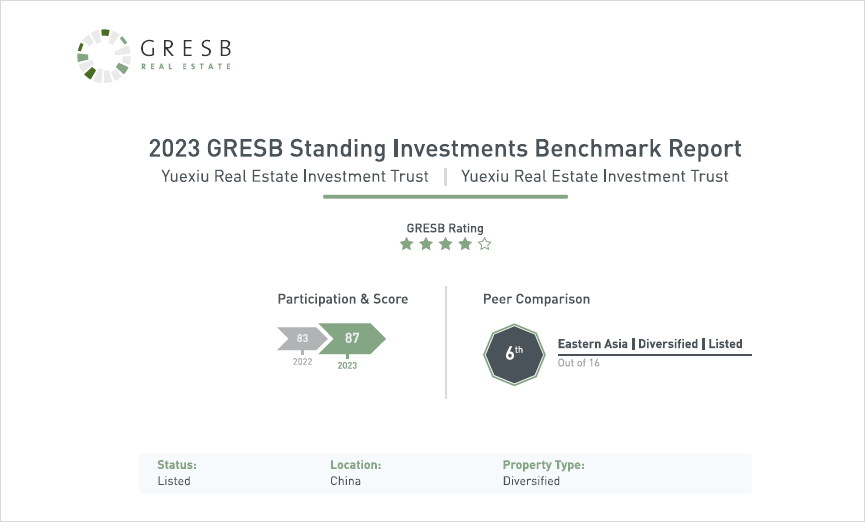 In October 2023, the Global Real Estate Sustainability Benchmark (GRESB) announced the 2023 rating results. Yuexiu REIT (00405.HK) received a "4 Stars" rating for the second consecutive year and the top Public Disclosure Level of "A" for the third consecutive year, in recognition of its outstanding performance in sustainable development by the independent organization that produces the internationally recognized benchmark for the real estate sector.