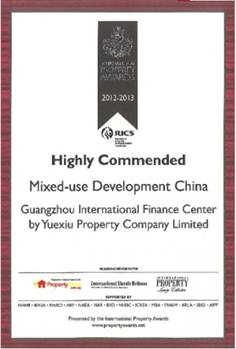 2013-Guangzhou International Finance Center was presented the international property award in Asian-Pacific area award ceremony