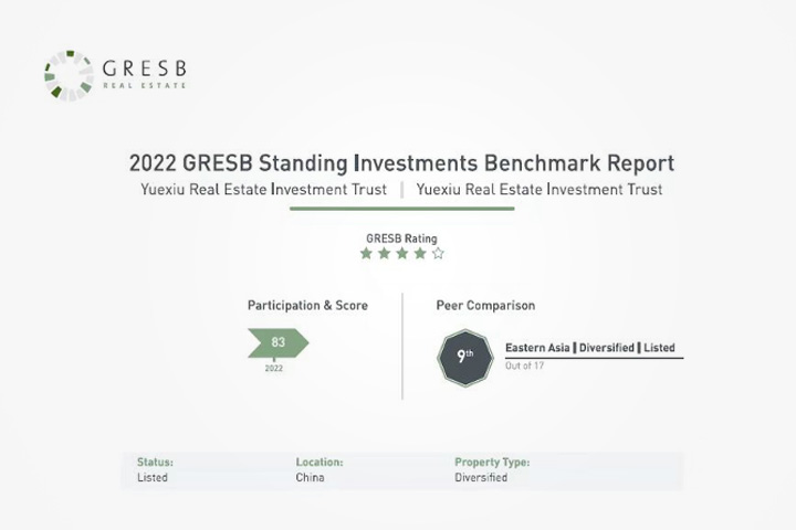In October 2023, the Global Real Estate Sustainability Benchmark (GRESB) announced the 2023 rating results. Yuexiu REIT (00405.HK) received a "4 Stars" rating for the second consecutive year and the top Public Disclosure Level of "A" for the third consecutive year, in recognition of its outstanding performance in sustainable development by the independent organization that produces the internationally recognized benchmark for the real estate sector. Yuexiu REIT has always viewed in ESG (environmental, social and governance) capacity building from a strategic perspective, integrating international standards to promote sustainable development. Yuexiu REIT participated in GRESB rating for the first time in 2021, and has since continuously made positive improvements in various major areas of sustainable development. In terms of sustainable development performance, in this round of evaluation, Yuexiu REIT received full marks in various aspects including Leadership, Reporting, Risk Assessment, Risk Management, Targets and Tenants & Community, achieving an overall GRESB Score of 87, equivalent to a year-over-year increase of 5%, ranking sixth in the peer group of "diversified listed company in Eastern Asia". Looking at the ESG score breakdown, Yuexiu REIT's scores across the three major pillars of Environment, Social and Governance all exceeded the GRESB average, with full score achieved in the Social pillar. In terms of public disclosure, Yuexiu REIT released standalone ESG reports (namely ESG report) annually since 2016, and set up a dedicated "Sustainability" section on its official website to disseminate ESG-related information on a continuous basis and strive to enhance transparency of ESG disclosure. In 2023, Yuexiu REIT's Public Disclosure Level received a high score of 96, ranking second among its peers in China, and receiving the top score of "A" for the third consecutive year. The rating results underscore Yuexiu REIT's achievement in sustainable development. Yuexiu REIT will continue to adhere to the concepts of co-prosperity, green development, and inclusive community, regarding ESG management as an important lever to enhance asset value and focus on creating long-term value for stakeholders. About GRESB Established in 2009, GRESB is the world's leading ESG benchmark for real estate and infrastructure investments, providing standardized and verified ESG information for financial markets. More than 150 institutions and financial investors are using GRESB in their decision-making. In 2023, 2,084 listed and unlisted real estate investment portfolios participated in the rating, representing approximately USD 7.2 trillion of gross asset value (GAV) across 75 countries and regions. (Source: GRESB website)