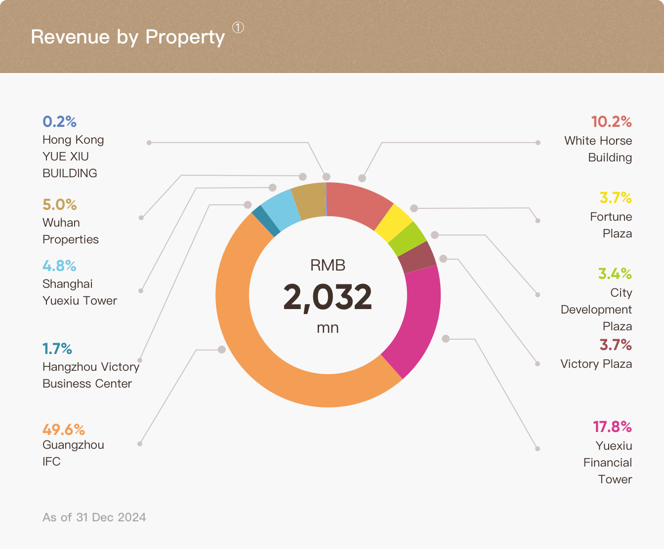 The Property portfolio of Yuexiu REIT comprises ten high quality properties, namely White Horse Building, Fortune Plaza, City Development Plaza, Victory Plaza, GZIFC, Yuexiu Financial Tower, Shanghai Yuexiu Tower, Wuhan Properties, Hangzhou Victory Business Centre, Hong Kong Yue Xiu Building. The overview of the Properties is as follows:
