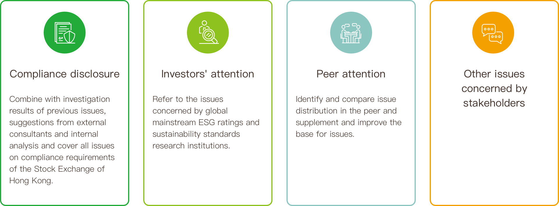 We conduct a multi-directional risk assessment and materiality analysis around ESG issues. Through the analysis of regulatory requirements, media research, peer benchmarking, questionnaire survey, and field investigation of the properties, we review and obtain material issues, which are the basis for the preparation of Environmental, Social, and Governance Report to ensure the reasonable disclosure of ESG-related information. We commissioned professional consultants to identify and analyze 23 sustainable development issues with a great impact on Yuexiu REIT's development based on our business development and industry characteristics, covering four dimensions: environment, society, operation, and employment.