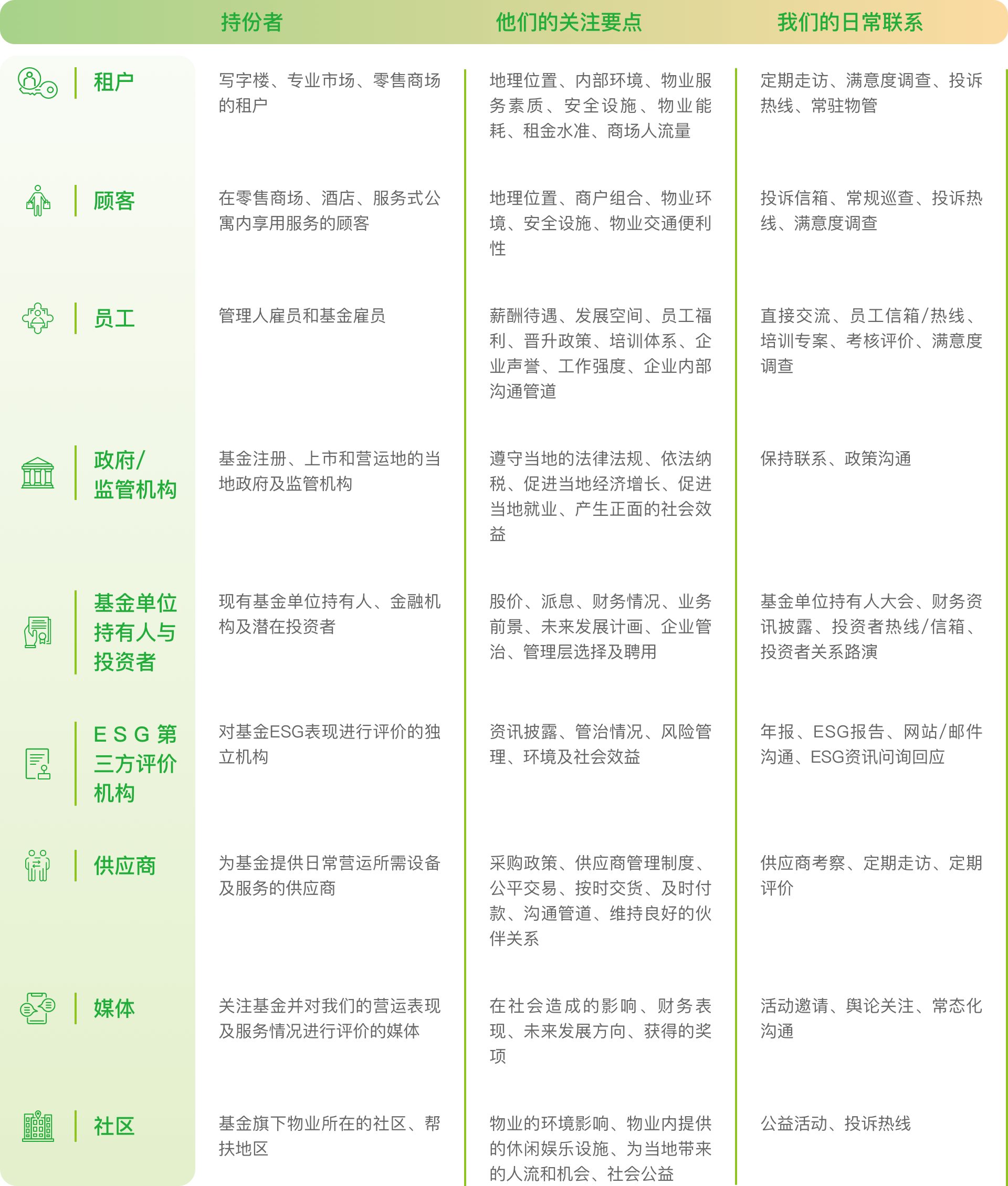 我们视政府机构、媒体、基金单位持有人及潜在投资者、ESG第三方评价机构、租户、顾客、员工、供应商和当地社区等为主要持份者。我们与各持份者继续保持良好有序的常态化沟通,具体沟通形式于下表列示。