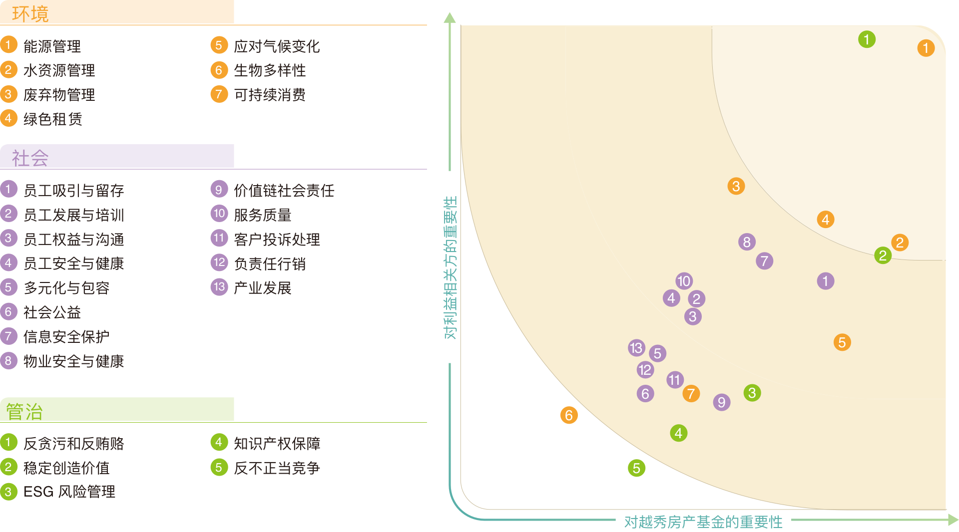 我们围绕ESG议题展开多方位风险评估及重要性分析。通过监管要求解析、媒体研究、同业对标、问卷调研和物业实地考察等,检视并得出重要性议题,作为环境、社会及管治报告的编製依据,确保ESG相关资讯得到合理披露。我们委托专业顾问,基于自身业务发展及行业特点,识別并分析出23个对基金发展影响较大的可持续发展议题,涵盖环境、社会、运营及雇佣四大维度。